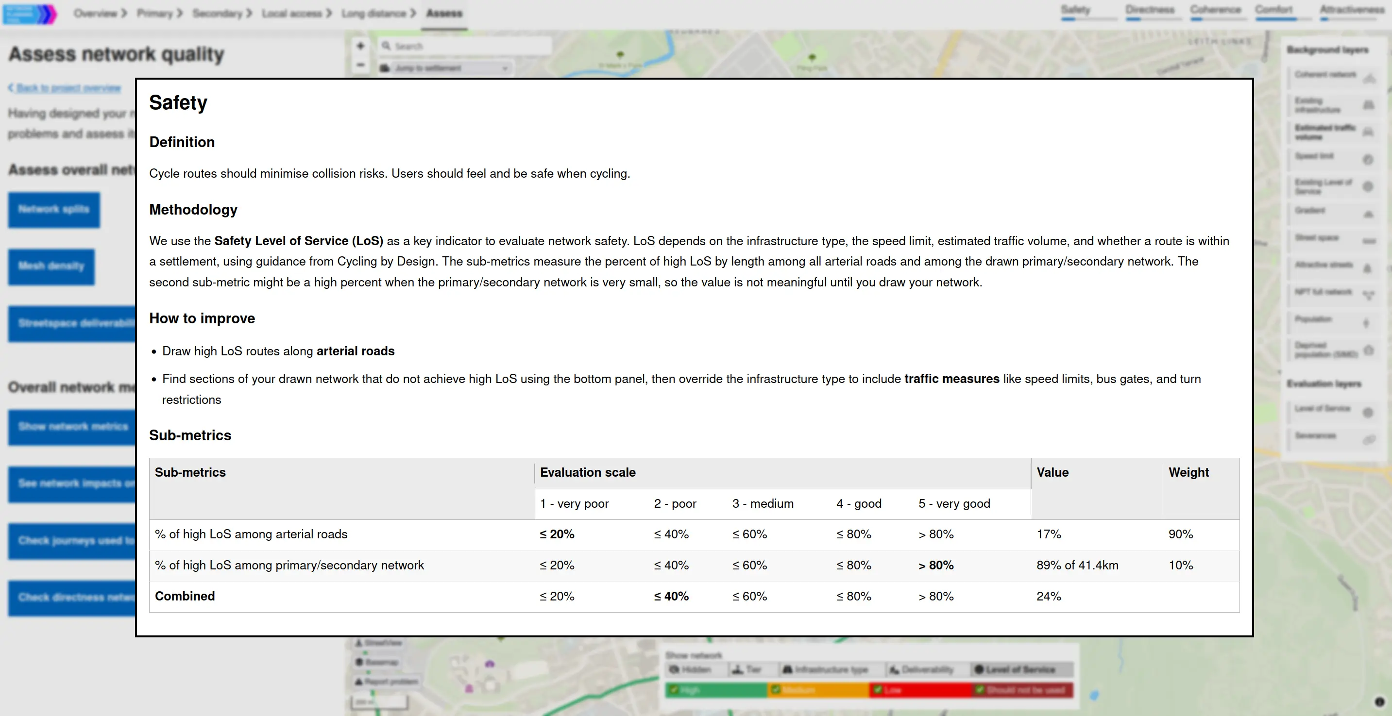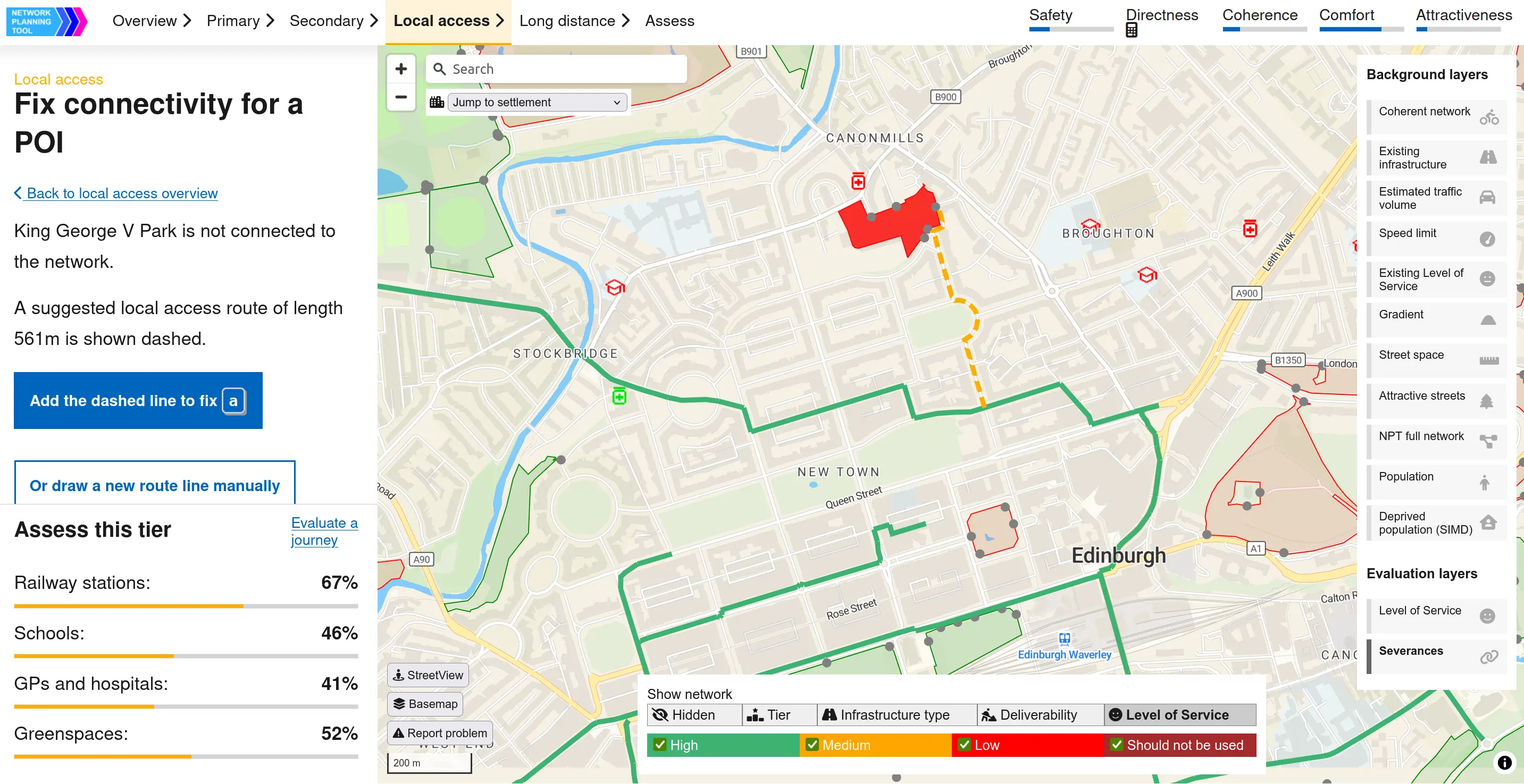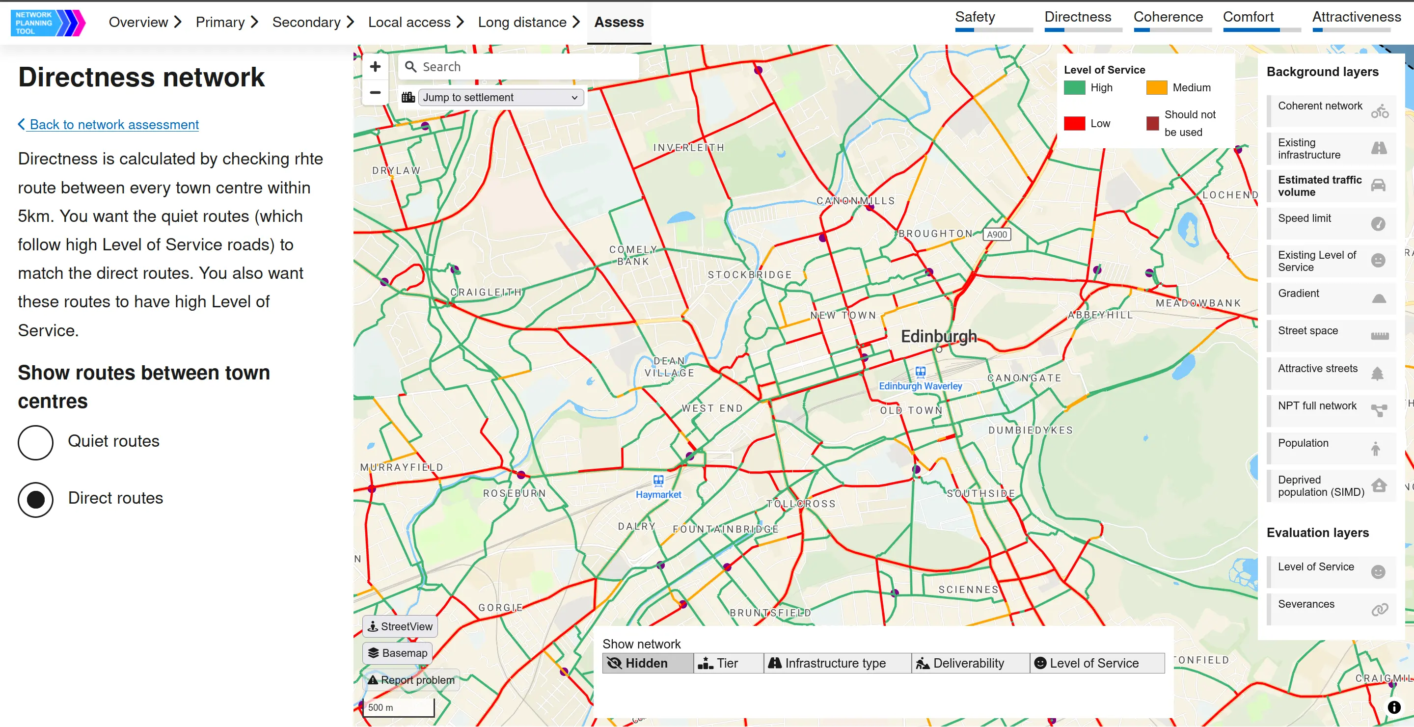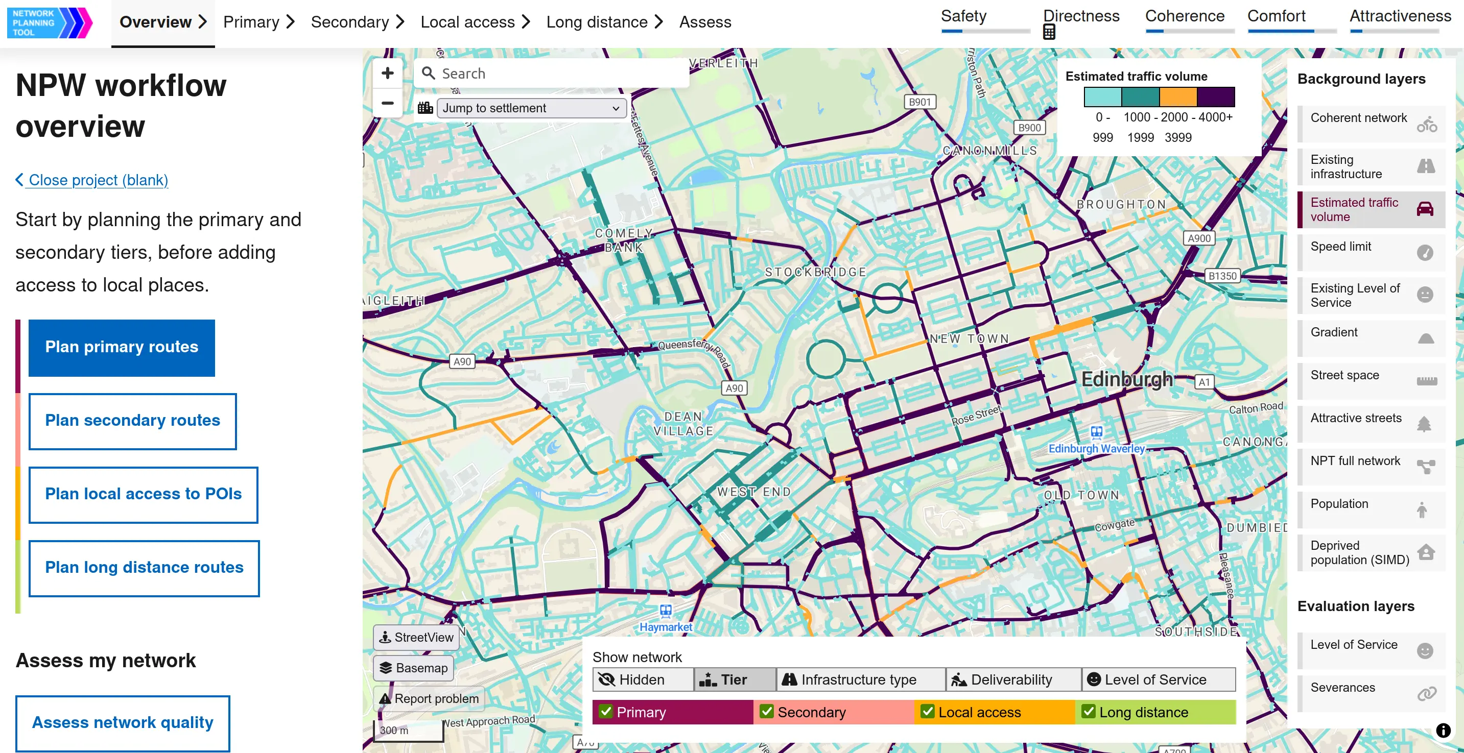 NPW was built for the Sustrans mobility team, funded by Transport Scotland. The larger NPT project has been running for a few years with ITS Leeds data science, and A/B Street Ltd joined in autumn 2024 to expand a static data visualization tool into a first-of-kind interactive network planning tool. It was very enjoyable working with Sustrans to turn the network quality metrics -- safety, directness, coherence, comfort, and attractiveness -- into specific quantifiable measurements that can be recalculated constantly. CycleStreets Ltd led the UX design, and together we transformed a swiss-army-knife tool into carefully guided workflows using the Scottish government design system. The initial feedback from local authorities has been incredibly detailed and positive; with just cursory training on the tool, officers have built reasonable network plans in an hour or two.