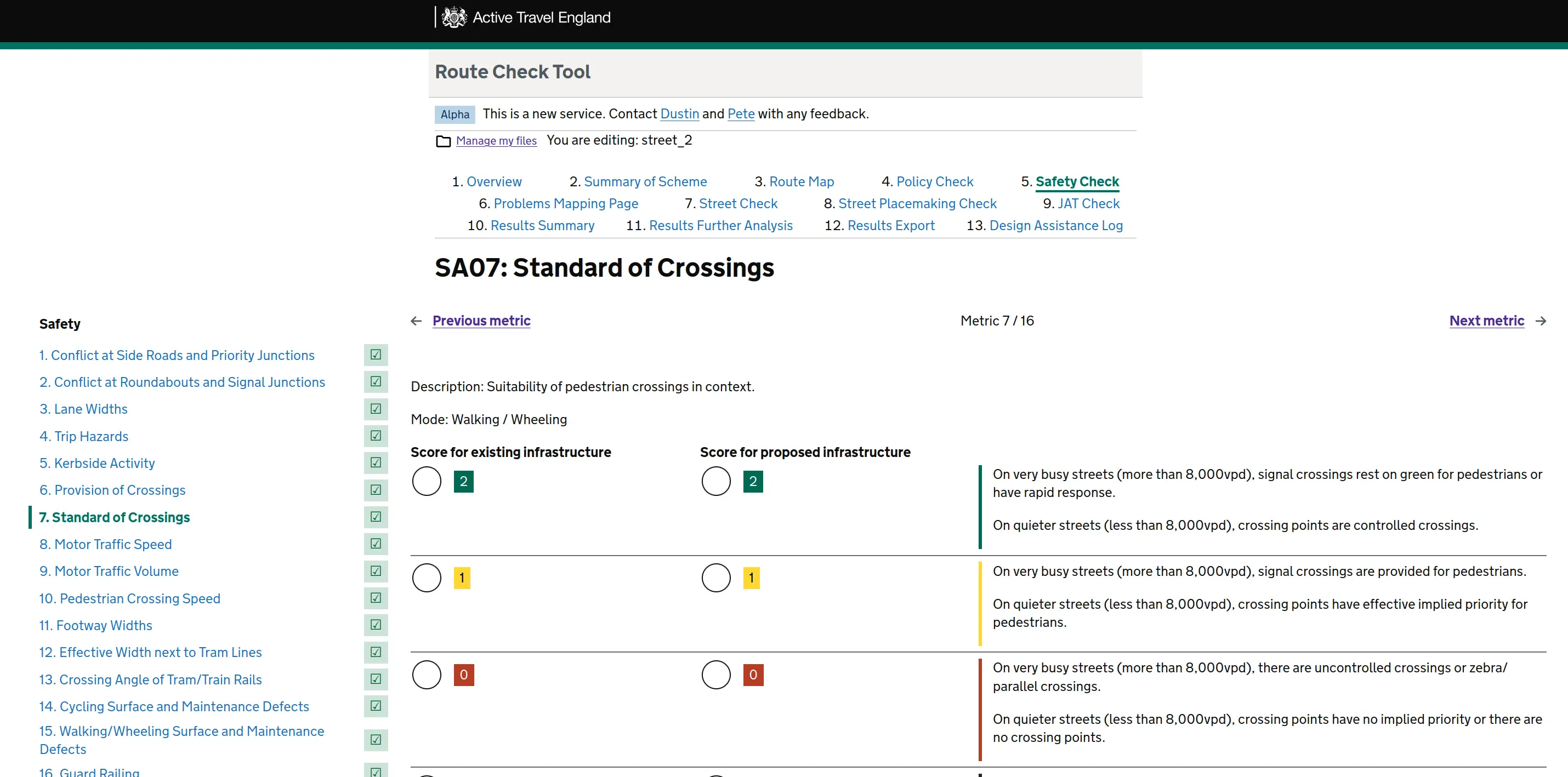 While Dustin was on secondment with Active Travel England (ATE) from 2023 to 2025, he led the digitisation of an Excel route check tool. This is used by both the Inspectorate team and external partners to evaluate the quality of an active travel route in great detail. The Excel tool suffers from some accessibility problems, and the web app uses the GOV.UK design system to make the tool much faster and easier to use.